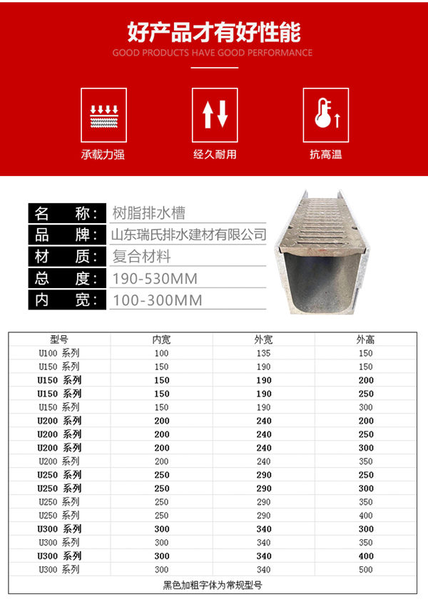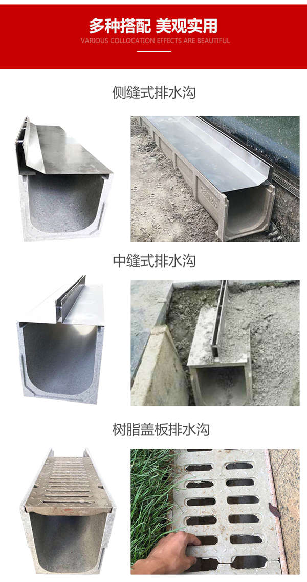 山東瑞氏排水建材有限公司專業(yè)生產(chǎn):樹脂混凝土排水溝成品排水溝線性排水溝樹脂排水溝、縫隙 式蓋板成品線性排水溝、球墨鑄鐵蓋板排水溝、模壓樹脂蓋板排水溝。 U型樹脂混凝土成品線性排水溝是由樹脂、石英砂及 復(fù)合材料混合而成,抗彎抗壓是水泥產(chǎn)品的2-3倍,提高 施工效率。耐酸堿、抗腐蝕,,抗凍融、抗?jié)B透、壽命 長,表面光滑,免維護(hù)等。 成品排水溝體上部可加配如下蓋板:縫隙式蓋板、球墨鑄鐵 蓋板、模壓樹脂蓋板、格柵網(wǎng)狀蓋板